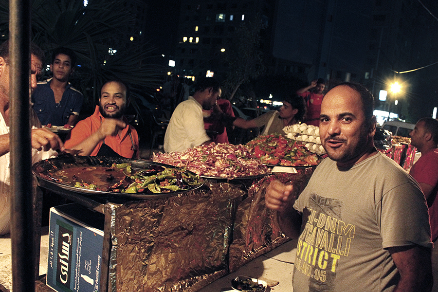 Mohammed Fouad, a vendor who has been selling foul and falafel in the Heliopolis neighborhood for the last five years, was busy stuffing pitas, handing them to hungry costumers and joking with his brother Fadi, who works with him. Familiar with most of the customers in the area, Mohammed told us that “Ramadan is such an exciting time. It’s probably my favorite time of the year, not just because business picks up at night before Suhoor, but also because Egyptians briefly forget about what’s going on politically and economically, and we all just unite, share food and enjoy the atmosphere”.