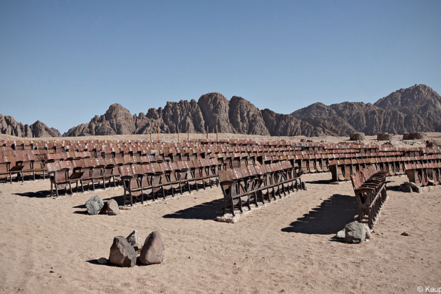 Estonian photographer Kaupo Kikkas had the chance to visit a very unique, under-appreciated site in Egypt: the End of the World outdoor cinema. The cinema isn’t exactly what you might expect though; it is comprised of 150 wooden chairs sitting right smack in the middle of the Sinai. Originally intended to become a functional cinema, the idea belonged to a wealthy Frenchman who wanted to invest in building a out-of-place theater in the middle of the desert in Egypt.