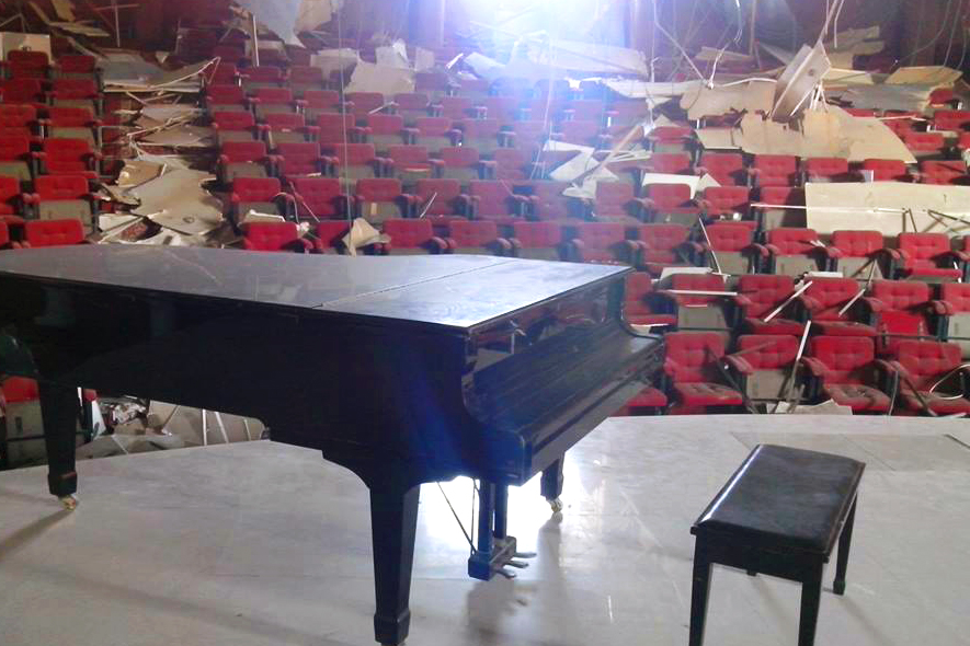 مسرح النورس شمال غزة، والذي يعد من بين المسارح القليلة في غزة، كان قد تم تجديده قبل أشهر من سقوط صاروخ على بعد أمتار منه خلال الحرب الأخيرة على القطاع. في وسط الحطام وقف هذا الـ “غراند بيانو” على رخام متصدع لخشبة المسرح، تعلوه الأتربة لكنه سليم.